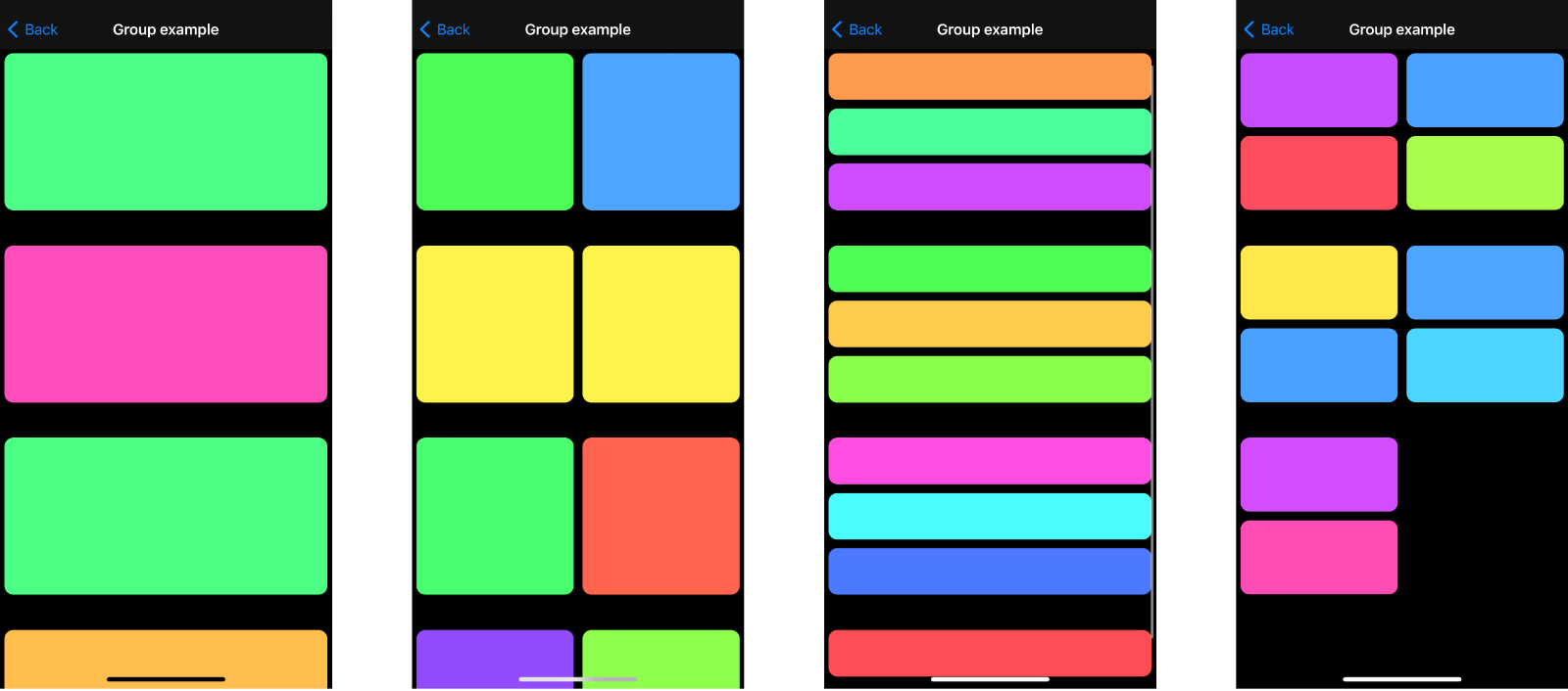 For more about NSCollectionLayoutGroup which lets you create layouts as shown below, check out this post.